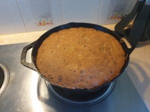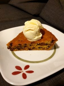 Welcome to Recipe Lab: where either myself or my brother attempt a fun vegetarian/vegan recipe, whether it be healthy or in this case, decidedly unhealthy. As I had recently graduated from Zoom university, I decided to make myself a cookie as a treat. However, this was no ordinary cookie, the cookie I chose to make was more like a pie cooked in a 12-inch cast-iron skillet. I’ve been fascinated with skillet cookies ever since a trip to Los Angeles when my friend Erin took me to try something called a pizookie. Since then, this concept has been itching in the back of my head.