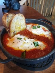 This Starbucks Reserve is a vast industrial-looking space combining a coffee roaster, Starbucks outlet, and an in-house Italian style bakery. The bakery is where my brother and I decided to have a spot of breakfast. I decided to get myself a baked egg dish that was essentially a shakshuka but with fewer of the traditional spices. My brother ordered something similar; however, his eggs came in a white sauce instead of a tomato-based sauce. The breakfast dishes came served in little cast iron skillets, with a side of sourdough slices. Since we were at a Starbucks and we were jetlagged, we obviously paired the breakfast with a comically large nitro cold brew.