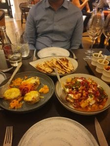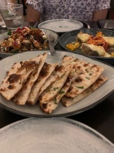 We ordered a tulsi paneer kebab and pap dip chaat as starters, and a ‘Mera Dabba’ with a yoghurt kebab, a paneer butter masala, and baingan bhartha (an eggplant dish) as a main course